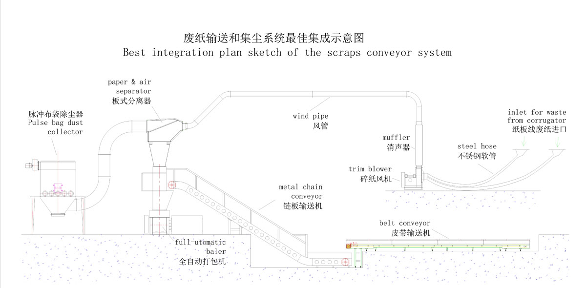 废纸输送和集尘系统主要由皮带输送机、碎纸风机及管道、印刷机纸尘管道、全自动打包机、纸气分离器、脉冲布袋除尘器等单元组成,其最佳集成原则: